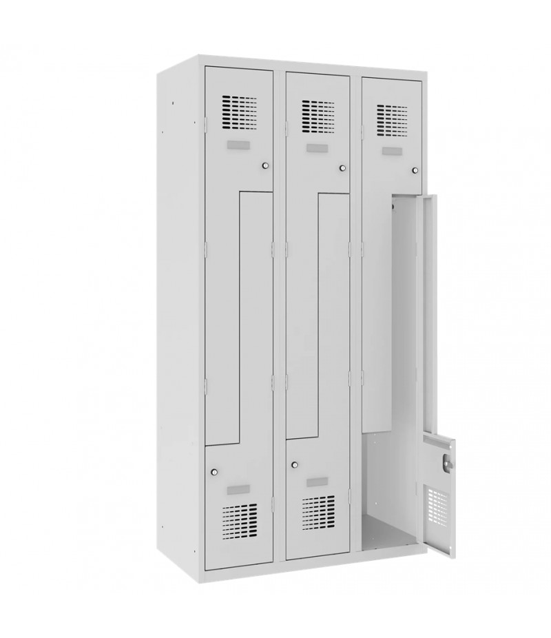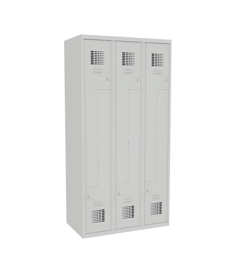 Šatňová štvordielna Z skriňa vyrobená z vysokokvalitného plechu je vhodná do priestorov šatní vo výrobných firmách, v školách, na športoviskách.